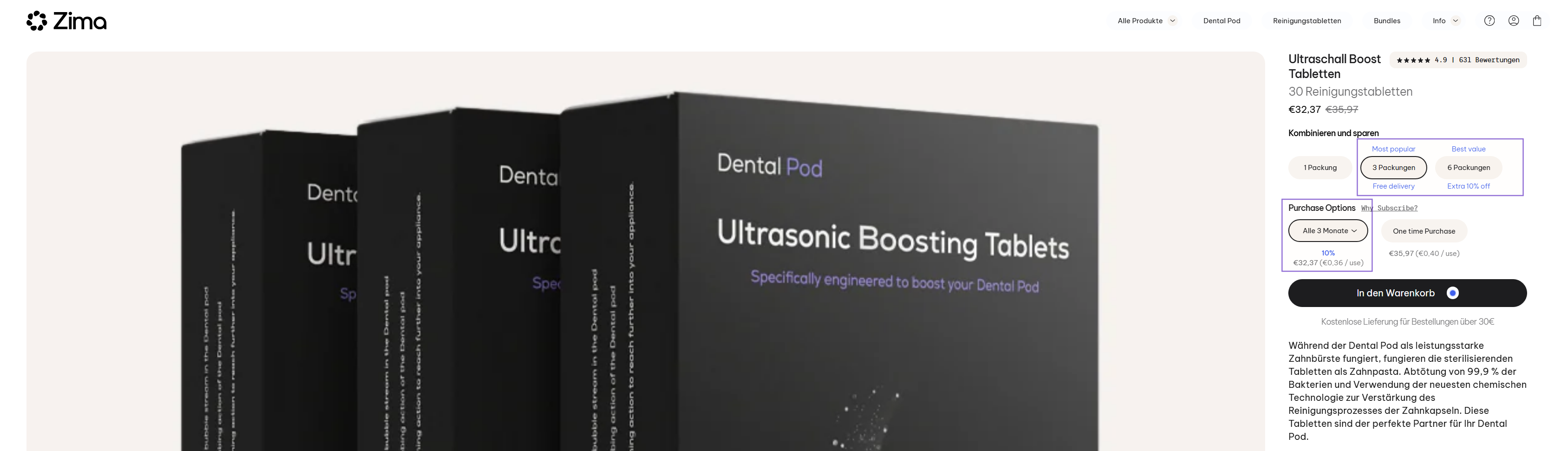 1. Menge auswählen: Entscheiden Sie, wie viele Packungen Ultrasonic Boosting-Tabletten Sie benötigen. Jede Packung enthält 30 Tabletten und ist in Paketen mit 1, 3 oder 6 Packungen erhältlich.